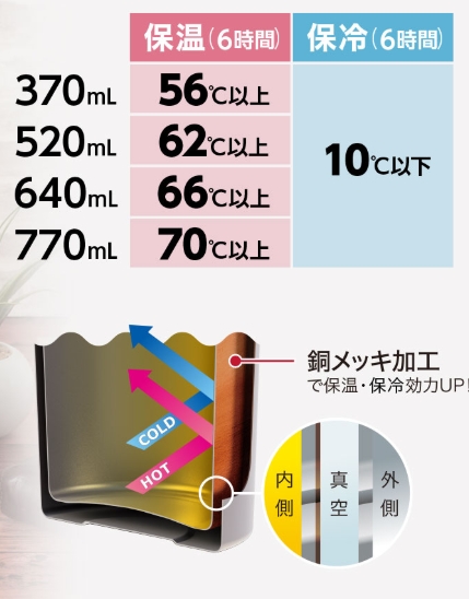 真空断熱構造+銅メッキ加工で保温・保冷効果が長持ち。